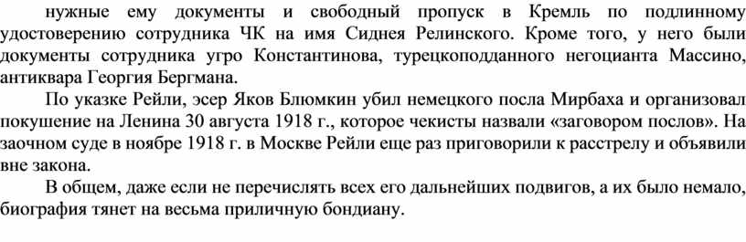 По указке Рейли, эсер Яков Блюмкин убил немецкого посла Мирбаха и организовал покушение на Ленина 30 августа 1918 г., которое чекисты назвали «заговором послов». На заочном суде в ноябре 1918 г. в Москве Рейли еще раз приговорили к расстрелу и объявили вне закона.