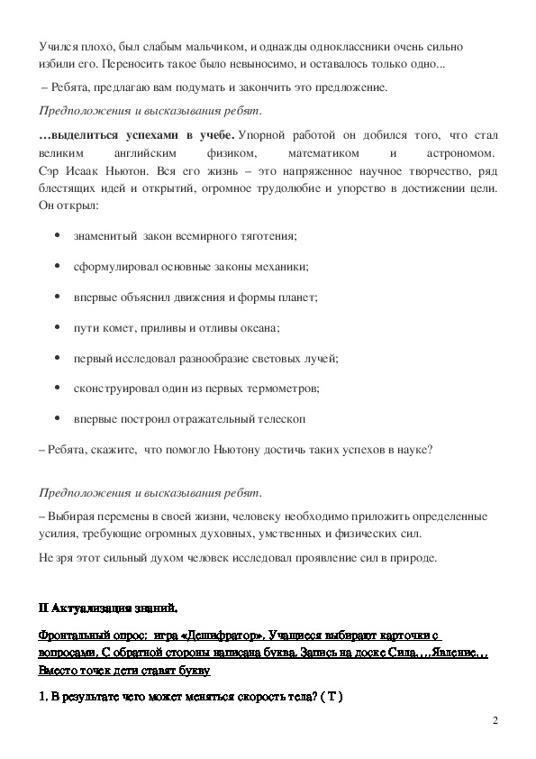 – Ребята, скажите, что помогло Ньютону достичь таких успехов в науке?