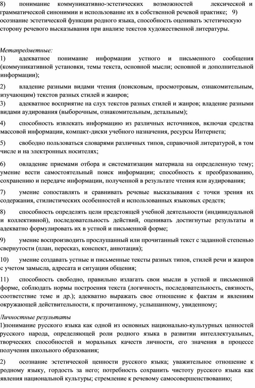 8) понимание коммуникативно-эстетических возможностей лексической и грамматической синонимии и использование их в собственной речевой практике; 9) осознание эстетической функции родного языка, способность оценивать эстетическую сторону речевого высказывания при анализе текстов художественной литературы.