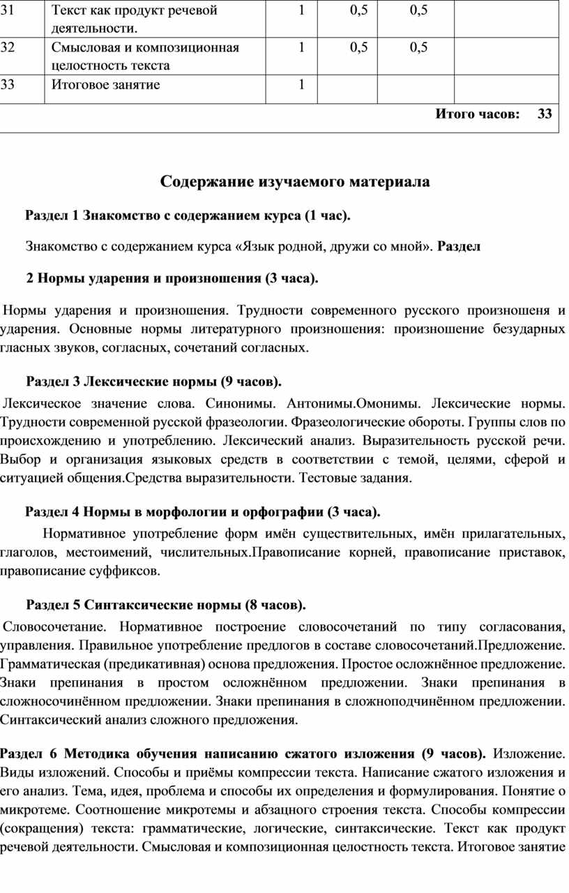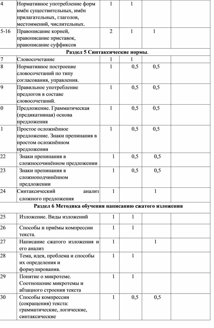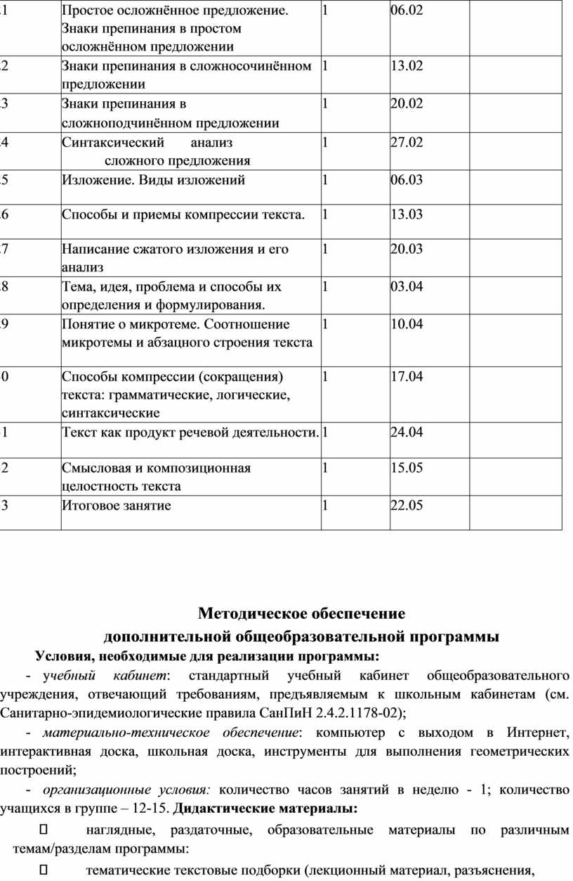 Раздел 6 Методика обучения написанию сжатого изложения (9 часов). Изложение. Виды изложений. Способы и приёмы компрессии текста. Написание сжатого изложения и его анализ. Тема, идея, проблема и способы их определения и формулирования. Понятие о микротеме. Соотношение микротемы и абзацного строения текста. Способы компрессии (сокращения) текста: грамматические, логические, синтаксические. Текст как продукт речевой деятельности. Смысловая и композиционная целостность текста. Итоговое занятие