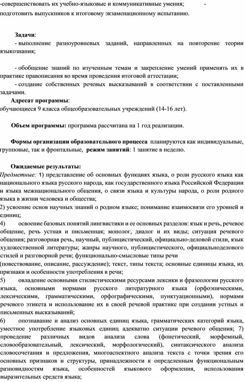 Актуальность создания данной программы. Государственная итоговая аттестация - это важный стимул для более глубокого изучения русского языка. В наш информационный век способность воспринимать и обрабатывать информацию, аргументировать и грамотно строить собственные высказывания - важные умения, постоянно используемые в современной жизни. Предлагаемая программа кружка поможет обеспечить эффективную подготовку учащихся 9 классов к выпускному экзамену по русскому языку в форме ГИА и сделать ещё один важный шаг к успешному будущему.