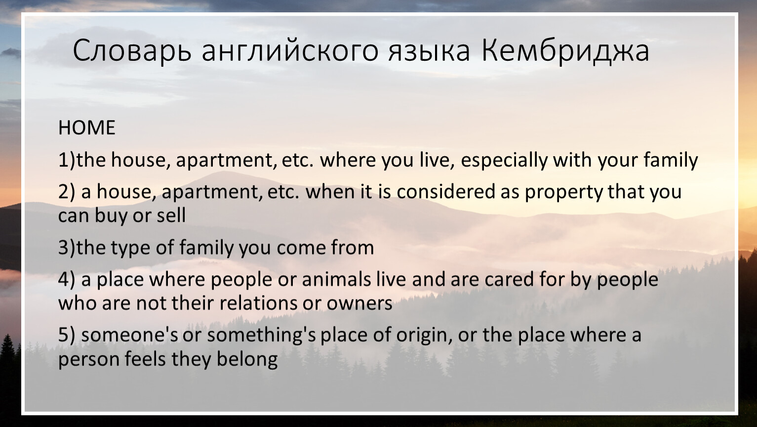 Гипотеза: Английские слова home и house имеют совпадения по семантическому значению и употреблению с русским словом дом, однако могут присутствовать и различия