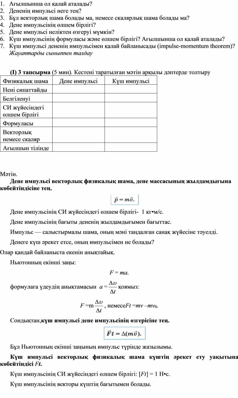 шама 2. Ағылшынша ол қалай аталады? 3. Дененің импульсі неге тең? 4. Бұл векторлық шама болады ма, немесе скалярлық шама болады ма? 5. Дене импульсінің өлшем бірлігі? 6. Дене импульсі неліктен өзгеруі мүмкін? 7. Күш импульсінің формуласы және өлшем бірлігі? Ағылшынша ол қалай аталады? 8. Күш импульсі дененің импульсімен қалай байланысады (impulse-momentum theorem)? Жауаптарды сыныппен талдау