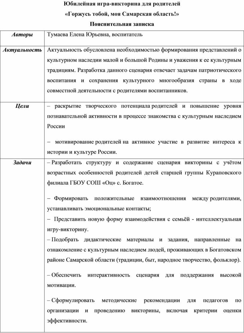 – Разработать структуру и содержание сценария викторины с учётом возрастных особенностей родителей детей старшей группы Кураповского филиала ГБОУ СОШ «Оц» с. Богатое. - Формировать положительные взаимоотношения между родителями, устанавливать эмоциональные контакты; - Представить новую форму взаимодействия с семьёй - интеллектуальная игру-викторину. – Подобрать дидактические материалы и задания, направленные на ознакомление с культурным наследием людей, проживающих в Богатовском районе Самарской области (традиции, быт, народное творчество, фольклор). – Обеспечить интерактивность сценария для поддержания высокой мотивации. – Сформулировать методические рекомендации для педагогов по организации и проведению викторины, включая критерии оценки эффективности. – Способствовать повышению педагогической культуры родителей в вопросах развития интереса к культуре, традициям, жизни большой и малой Родины. |