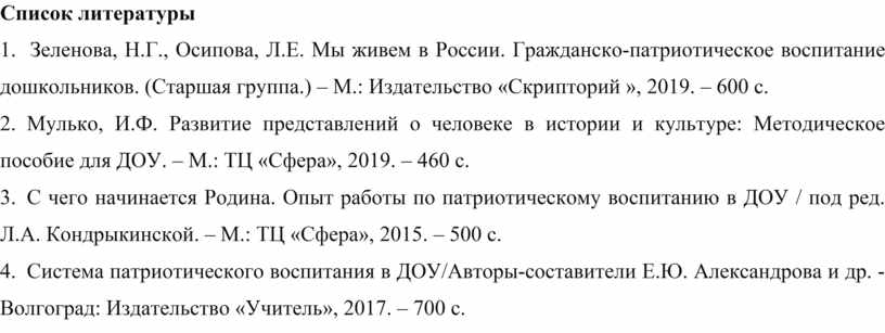 1. Зеленова, Н.Г., Осипова, Л.Е. Мы живем в России. Гражданско-патриотическое воспитание дошкольников. (Старшая группа.) – М.: Издательство «Скрипторий », 2019. – 600 с.
