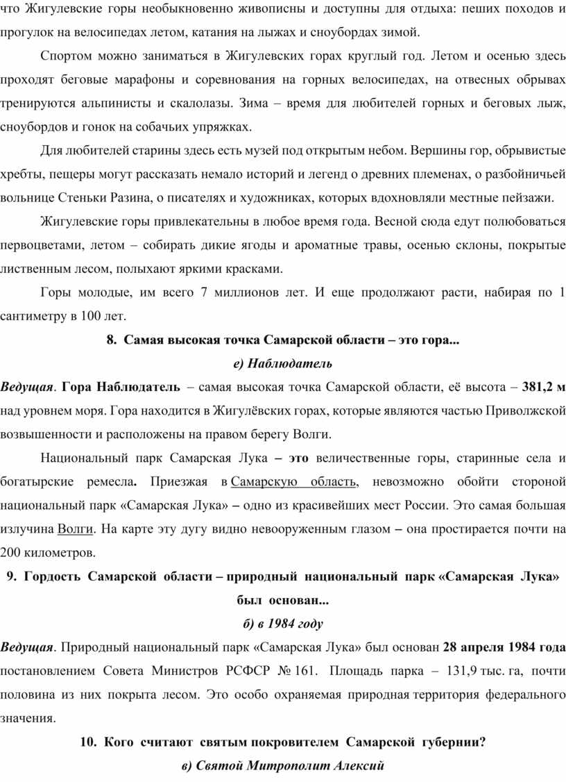 Ведущая. Жигулевские горы – сердце Самарской Луки. Волга, огибая их скалистые, поросшие лесом хребты, описывает почти полный круг. Их называют «волжской Швейцарией», потому что Жигулевские горы необыкновенно живописны и доступны для отдыха: пеших походов и прогулок на велосипедах летом, катания на лыжах и сноубордах зимой.
