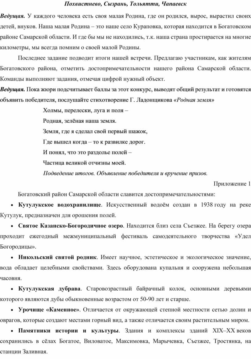 Ведущая. У каждого человека есть своя малая Родина, где он родился, вырос, вырастил своих детей, внуков. Наша малая Родина – это наше село Кураповка, которая находится в Богатовском районе Самарской области. И где бы мы не находились, т.к. наша страна простирается на многие километры, мы всегда помним о своей малой Родины.