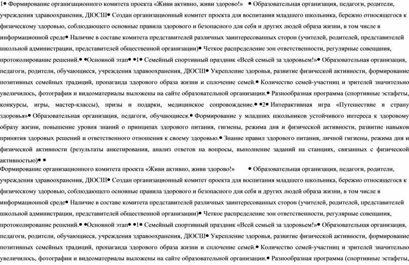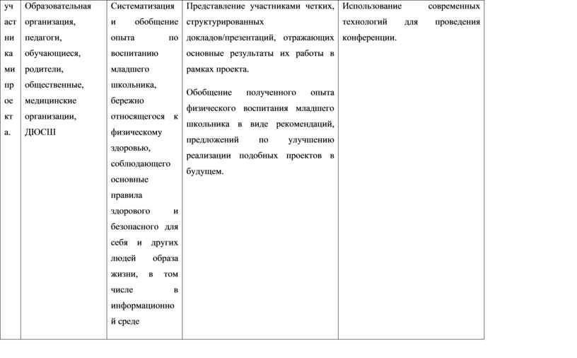 Представление участниками четких, структурированных докладов/презентаций, отражающих основные результаты их работы в рамках проекта. Обобщение полученного опыта физического воспитания младшего школьника в виде рекомендаций, предложений по улучшению реализации подобных проектов в будущем. |