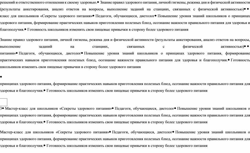 Повышение уровня знаний школьников о принципах здорового питания, формирование практических навыков приготовления полезных блюд, осознание важности правильного питания для здоровья и благополучия. |