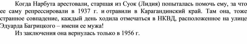 Когда Нарбута арестовали, старшая из Суок (Лидия) попыталась помочь ему, за что ее саму репрессировали в 1937 г. и отравили в Карагандинский край. Там она, тоже странное совпадение, каждый день ходила отмечаться в НКВД, расположенное на улице Эдуарда Багрицкого – имени ее мужа!