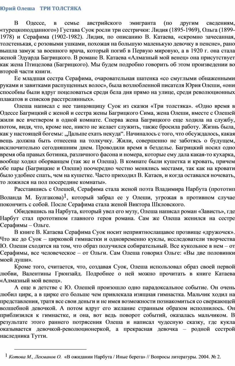 В книге В. Катаева Серафима Суок носит неприятнослащавое прозвище «дружочек». Что же до Суок – цирковой гимнастки и одновременно куклы, исследователи творчества Ю. Олеши сходятся на том, что образ получился собирательный. Все кукольное в нем – от Серафимы, все человеческое – от Ольги. Сам Олеша говорил Ольге: «Вы две половинки моей души».