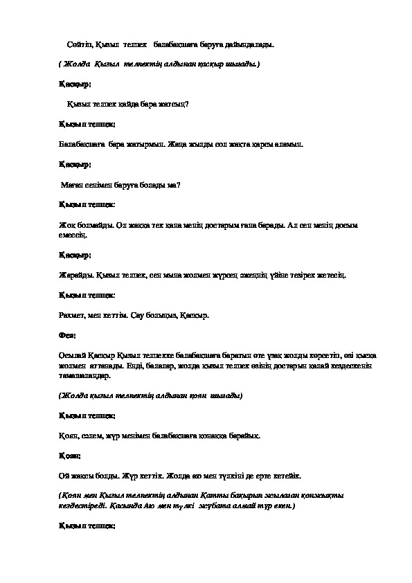 Фея:Сөйтіп, Қызыл телпек балабақшаға баруға дайындалады.