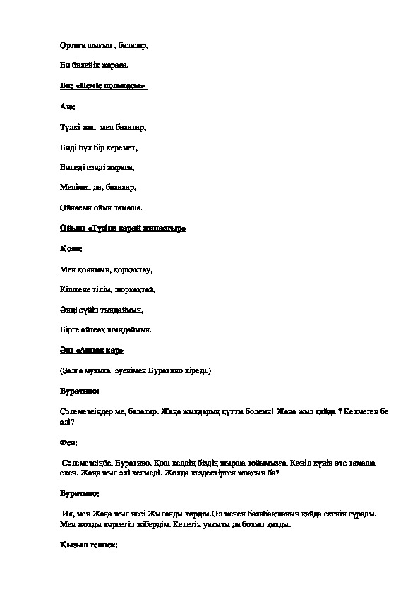 Қызыл телпек:Буратино, онда жаңа жыл иесі келгенше, екеуіміз, балалармен бір әсем би билесек қалай