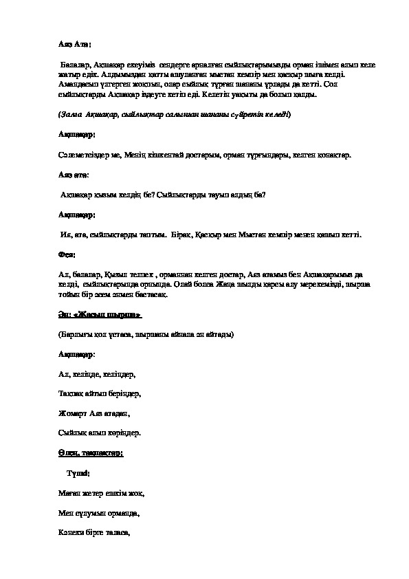 Сәлеметсіздерме балалар, мен ескі жыл иесі ұлумын. Сендермен бірге жаңа жыл иесін