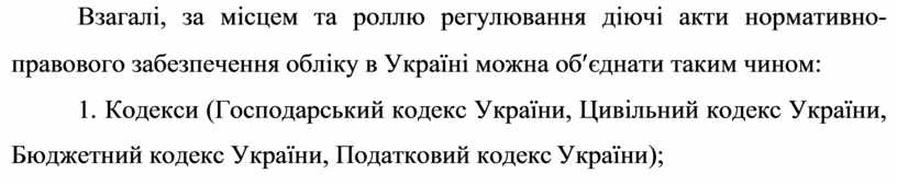 Взагалі, за місцем та роллю регулювання діючі акти нормативно- правового забезпечення обліку в Україні можна об¢єднати таким чином: