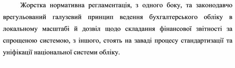 Жорстка нормативна регламентація, з одного боку, та законодавчо врегульований галузевий принцип ведення бухгалтерського обліку в локальному масштабі й дозвіл щодо складання фінансової звітності за спрощеною системою, з іншого, стоять на заваді процесу стандартизації та уніфікації національної системи обліку.
