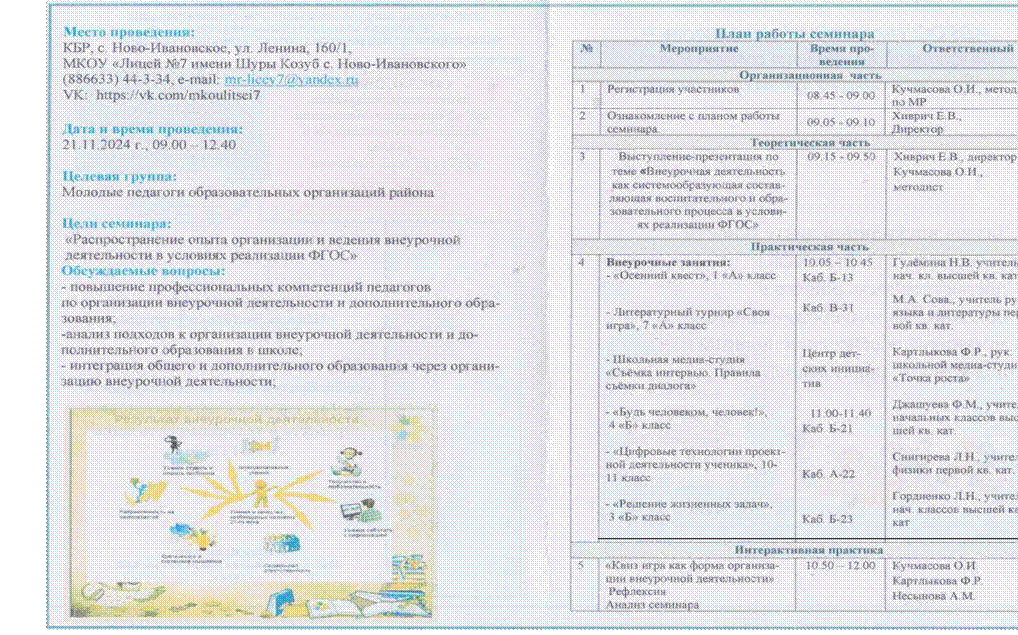 Заявление на организацию очной площадки! info@phystechunion.org Здравствуйте организаторы Всероссийской физико-технической контрольной «Выходи решать!» Прошу включить нашу площадку с Идентификационным номером : VR2023090102 в конкурс очных площадок. Заранее просим извинение, т.к. по техническим причинам не могли ее зарегистрировать 2 недели ранее, о чем писали на почту. С уважением. 4. Мотивационное письмо с ответами на вопросы: а) Почему ваша площадка должна стать «опорной»? 1.Площадка организована в селе на стыке двух дорог на Нальчик и на Пятигорск, в современной новой школе третьего десятилетия, т.е. ребята изучают науки на современном цифровом оборудовании. 2.Лицей носит имя пионера-героя Шуры Козуб. Воспитание детей во все непростые времена страны было есть и будет ориентировано на патриотическую любовь к Родине! (скоро прикрепим видео ролик). б) Как проект “Выходи решать!” меняет к лучшему вашу школу/город/Россию/мир? Россия всегда была страной безграничных возможностей в чем уверены ученики нашей школы как и в том, что возрождение России будет идти с села.Выпускники лицея становятся призерами и победителями конкурсов и олимпиад, активно представляют Республику на Всероссийских мероприятиях. Половина учительского состава получив образование в Вузах России работают в той же школе что и закончили! Поэтому это великолепная возможность идти в ногу с научно-техническим прогрессом! в) Каков ваш план проведения “Выходи решать!” в 2023 году? 1. Неделя организационная. Оформить демонстрационный стенд. Раздать задания на научную игру квест среди 8-11 классов. Снять видеопривет о площадке. Раздать темы выступлений в 10-11 классах на организацию круглого стола по вопросам современной науки. 2. Неделя. Провести игру-квест, подключение онлайн-лекций от МФТИ, День моих проектов: докладчики представляют кратко свой проект и независимое голосование учащихся школы. 3. Неделя. Круглый стол «Наука и технологии» 4. Неделя Консультация «Разбор заданий прошлых лет» г) Как вы дополнительно будете вовлекать участников площадки в изучение технических предметов и естественно-технические науки? На сегодняшний момент, в рамках национального проекта «Образование», В Лицее № 7 действуют центры образования «Точка роста» с целью развития у обучающихся естественно-научной, математической, информационной грамотности, формирования критического и креативного мышления, совершенствования навыков естественно-научной направленности, а также для практической отработки учебного материала по учебным предметам «Математика», «Физика», «Химия», «Биология», «Информатика». Современное техническое и цифровое оборудование центров позволяет развивать внимание ученика используя восприятие всех органов чувств: зрения и слуха с помощью мультимедийных технологий; обоняния, эстетического вкуса, осязания при использовании цифровой лаборатории самостоятельно. Это великолепные центры «Школы радости» В.А. Сухомлинского и научных идей К. Д. Ушинского, в которых обучаются одаренные дети. Познавательный интерес как эмоция получения новой информации лежит в основе позитивного отношения к жизни вообще и к учёбе в частности. Если у человека сформирован такой интерес, то человек активно ищет ответы на вопросы, которые сам себе задаёт. Соответственно, одним из путей повышения эффектив