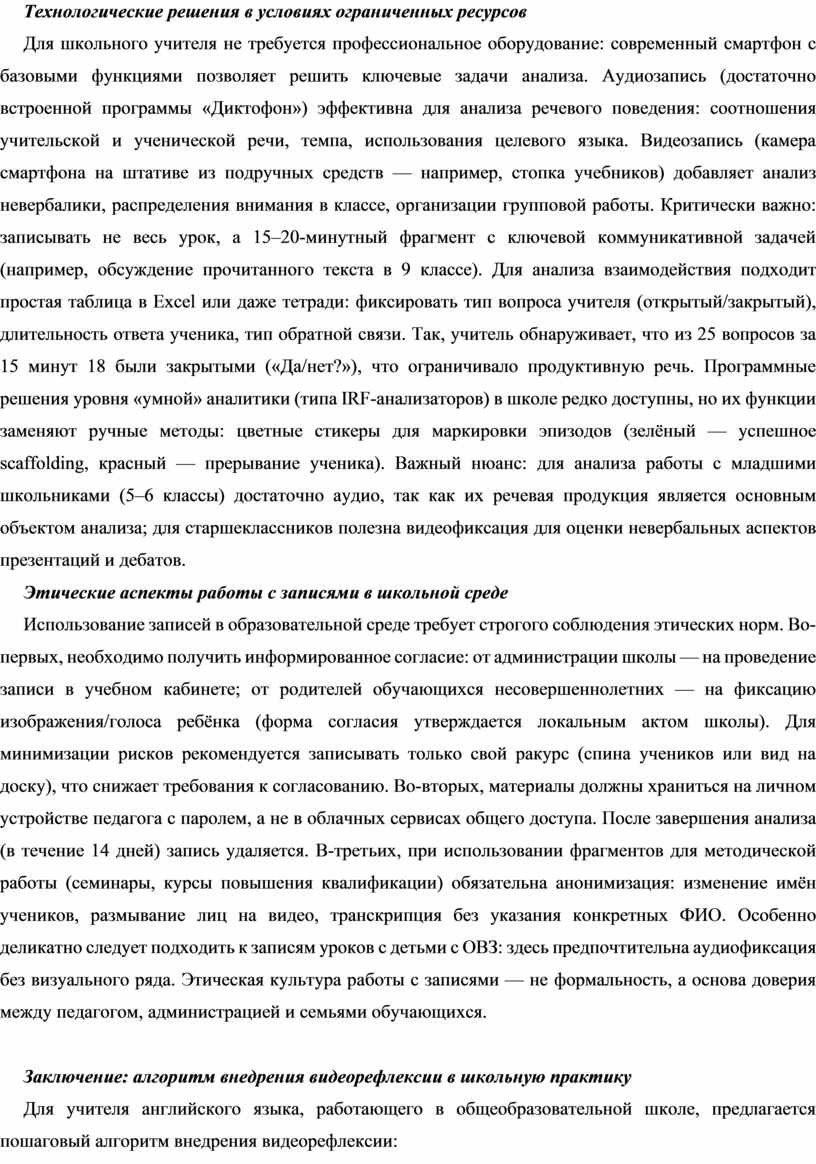 В условиях цифровизации образования и усиления требований ФГОС к рефлексивной практике учителя запись урока становится доступным инструментом профессионального роста. В статье рассматриваются теоретические основы педагогической рефлексии через призму теории Д. Шёна, практические возможности анализа речевого поведения (teacher talking time, артикуляция), управления классом и формативного оценивания. Особое внимание уделено адаптации методики для школьной среды с использованием смартфона и базовых приложений. Предложен пошаговый алгоритм внедрения видеорефлексии, учитывающий этические нормы и возрастные особенности обучающихся 5–11 классов.