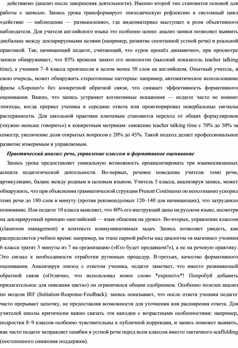 Концепция рефлексивной практики, разработанная Дональдом Шёнём, выделяет два типа рефлексии: «рефлексию в действии» (размышление педагога во время урока) и «рефлексию над действием» (анализ после завершения деятельности). Именно второй тип становится основой для работы с записью. Запись урока трансформирует эпизодическую рефлексию в системный цикл «действие — наблюдение — размышление», где видеоматериал выступает в роли объективного наблюдателя. Для учителя английского языка это особенно ценно: анализ записи позволяет выявить дисбаланс между декларируемыми целями (например, развитие спонтанной устной речи) и реальной практикой. Так, начинающий педагог, считающий, что «урок прошёл динамично», при просмотре записи обнаруживает, что 85% времени занято его монологом (высокий показатель teacher talking time), а ученики 7–8 класса произнесли в целом менее 50 слов на английском. Опытный учитель, в свою очередь, может обнаружить стереотипные паттерны: например, автоматическое использование фразы «Хорошо!» без конкретной обратной связи, что снижает эффективность формативного оценивания. Важно, что запись устраняет когнитивные искажения — педагог часто не помнит эпизоды, когда прервал ученика в середине ответа или проигнорировал невербальные сигналы растерянности. Для школьной практики ключевым становится переход от общих формулировок («нужно меньше говорить») к конкретным метрикам: снижение teacher talking time с 70% до 50% за семестр, увеличение доли открытых вопросов с 20% до 45%. Такой подход делает профессиональное развитие измеримым и управляемым.