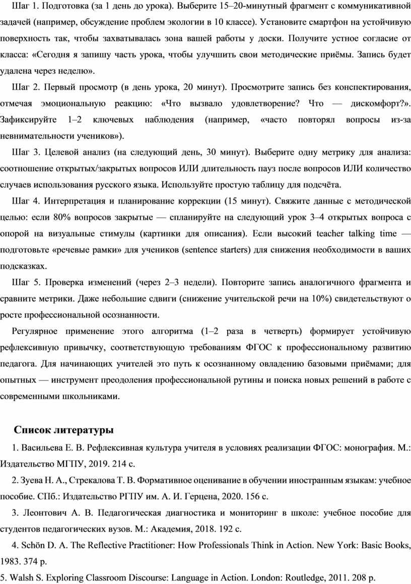 Шаг 5. Проверка изменений (через 2–3 недели). Повторите запись аналогичного фрагмента и сравните метрики. Даже небольшие сдвиги (снижение учительской речи на 10%) свидетельствуют о росте профессиональной осознанности.