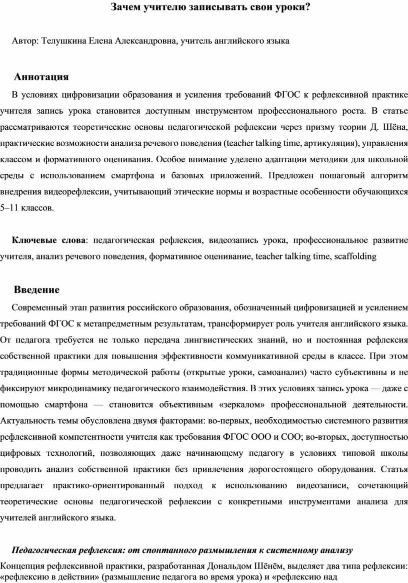 Современный этап развития российского образования, обозначенный цифровизацией и усилением требований ФГОС к метапредметным результатам, трансформирует роль учителя английского языка. От педагога требуется не только передача лингвистических знаний, но и постоянная рефлексия собственной практики для повышения эффективности коммуникативной среды в классе. При этом традиционные формы методической работы (открытые уроки, самоанализ) часто субъективны и не фиксируют микродинамику педагогического взаимодействия. В этих условиях запись урока — даже с помощью смартфона — становится объективным «зеркалом» профессиональной деятельности. Актуальность темы обусловлена двумя факторами: во-первых, необходимостью системного развития рефлексивной компетентности учителя как требования ФГОС ООО и СОО; во-вторых, доступностью цифровых технологий, позволяющих даже начинающему педагогу в условиях типовой школы проводить анализ собственной практики без привлечения дорогостоящего оборудования. Статья предлагает практико-ориентированный подход к использованию видеозаписи, сочетающий теоретические основы педагогической рефлексии с конкретными инструментами анализа для учителей английского языка.