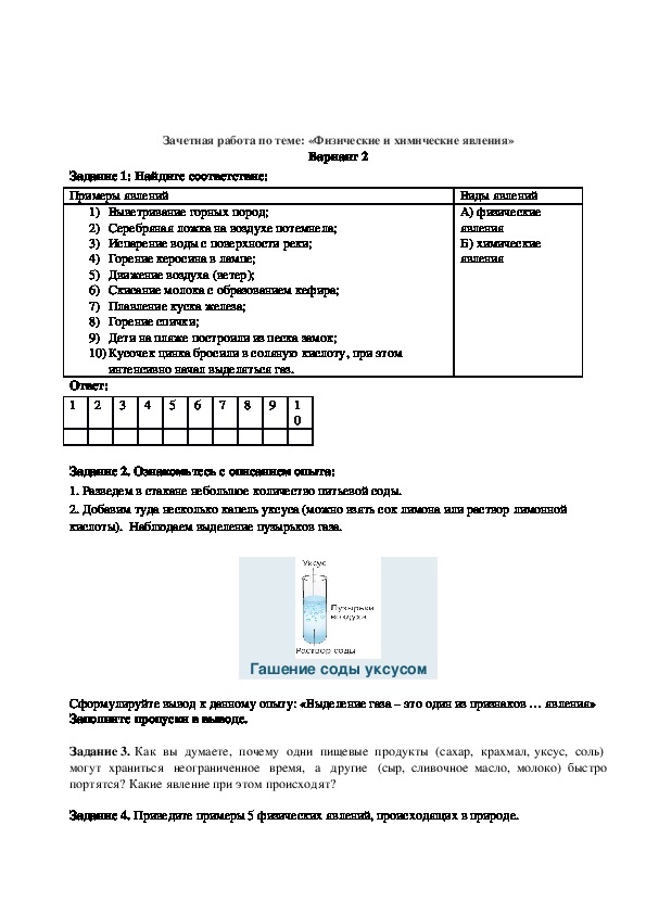 Дидактический материал содержит задания для проведения зачетной работы по химии по теме: "Физические и химические явления" в двух вариантах. Предлагается задание на соответствие, на анализ содержания конкретного опыта и формулировки к нему вывода, на умение приводить примеры по теме, на знание теоретического материала.