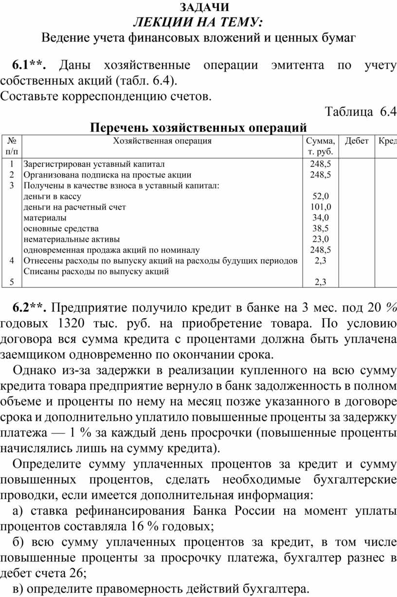 6.1**. Даны хозяйственные операции эмитента по учету собственных акций (табл. 6.4).