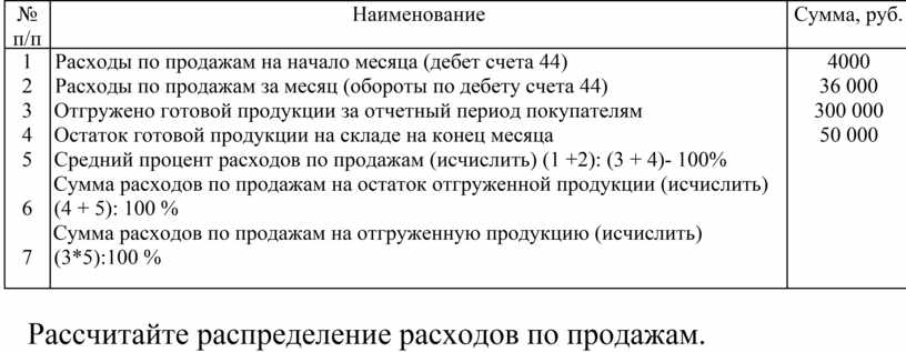 Расходы по продажам на начало месяца (дебет счета 44) Расходы по продажам за месяц (обороты по дебету счета 44) Отгружено готовой продукции за отчетный период покупателям Остаток готовой продукции на складе на конец месяца Средний процент расходов по продажам (исчислить) (1 +2): (3 + 4)- 100% Сумма расходов по продажам на остаток отгруженной продукции (исчислить) (4 + 5): 100 % Сумма расходов по продажам на отгруженную продукцию (исчислить) (3*5):100 % |