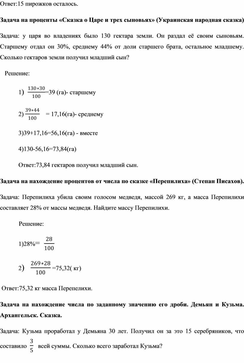 Задача на проценты «Сказка о Царе и трех сыновьях» (Украинская народная сказка)