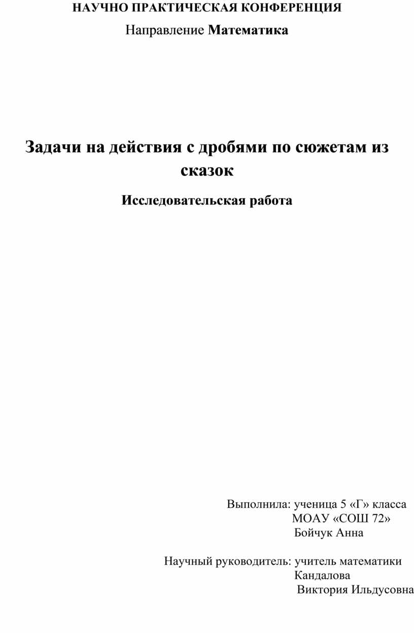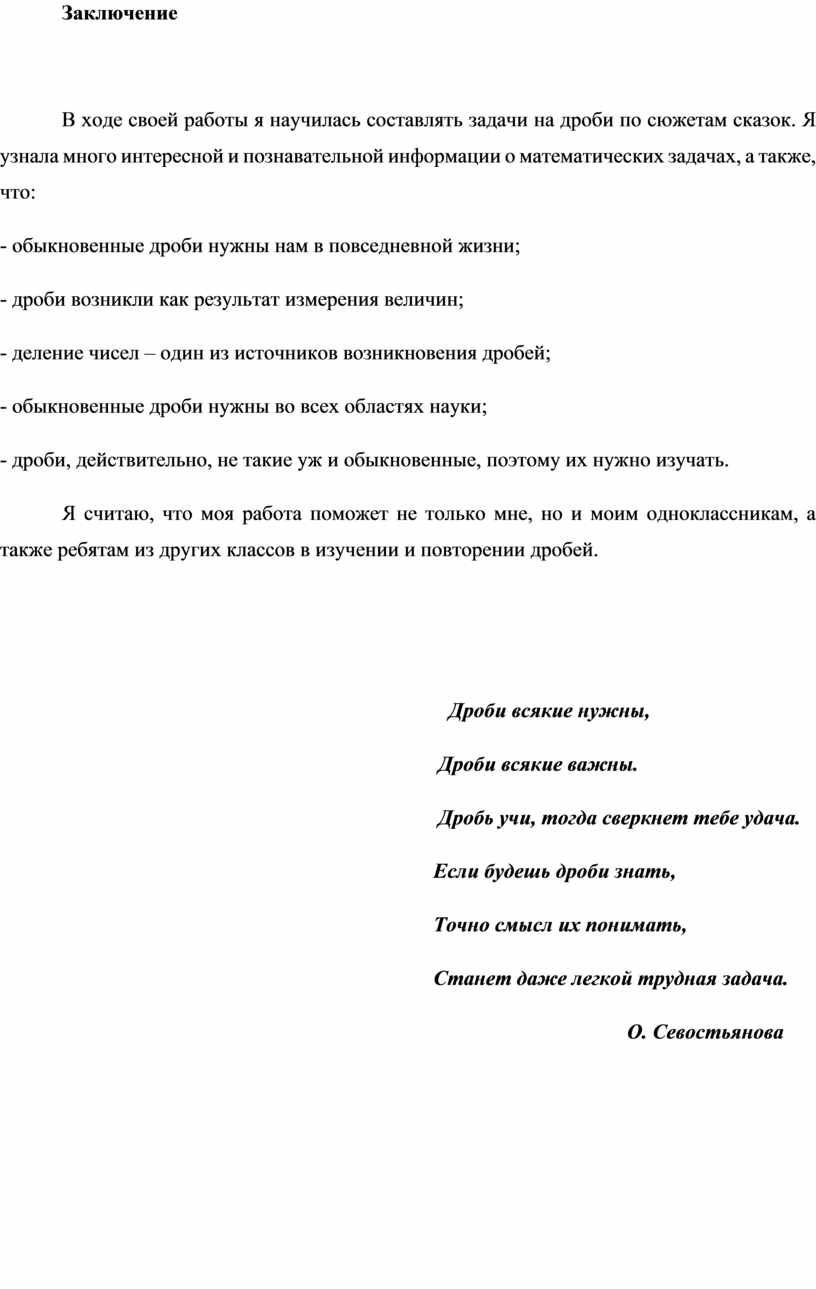 В ходе своей работы я научилась составлять задачи на дроби по сюжетам сказок. Я узнала много интересной и познавательной информации о математических задачах, а также, что: