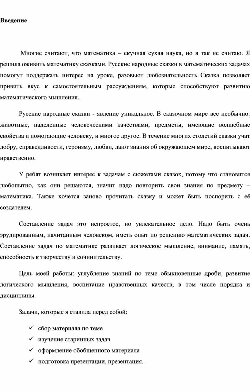 Многие считают, что математика – скучная сухая наука, но я так не считаю. Я решила оживить математику сказками. Русские народные сказки в математических задачах помогут поддержать интерес на уроке, разовьют любознательность. Сказка позволяет привить вкус к самостоятельным рассуждениям, которые способствуют развитию математического мышления.