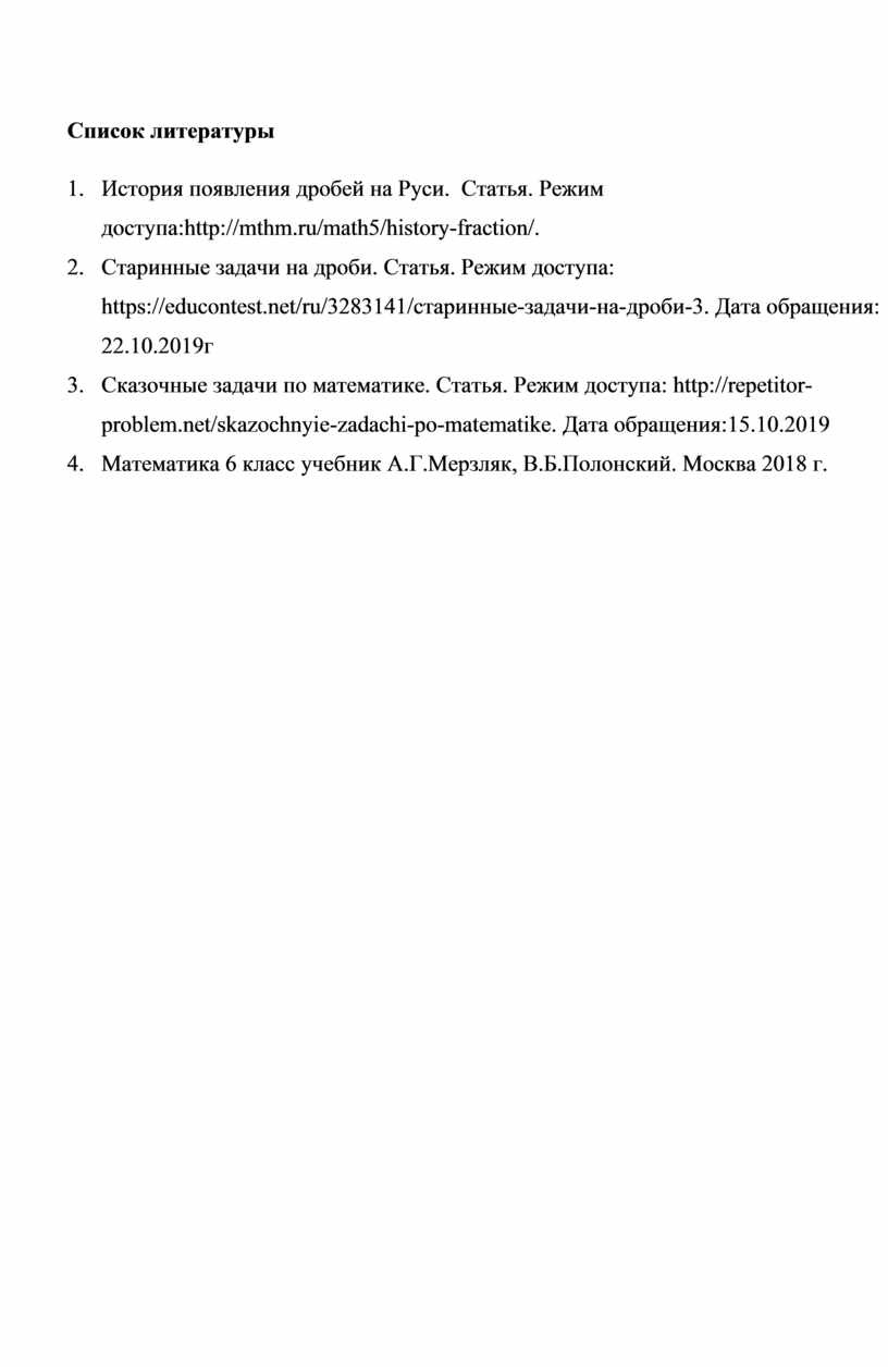 2. Старинные задачи на дроби. Статья. Режим доступа: https://educontest.net/ru/3283141/старинные-задачи-на-дроби-3. Дата обращения: 22.10.2019г