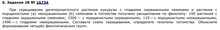 Гладкая форма семян кукурузы доминирует над морщинистой, а окрашенные семена – над неокрашенными. При скрещивании растений кукурузы с гладкими окрашенными семенами и с морщинистыми неокрашенными семенами получено следующее потомство: