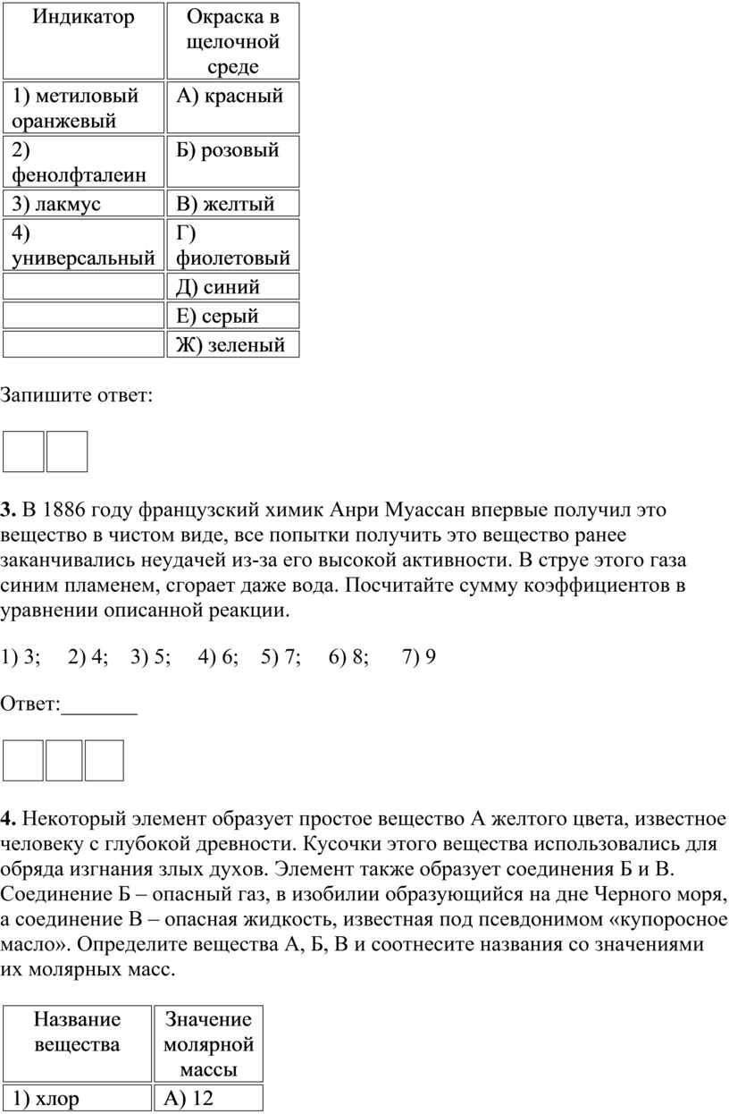 3. В 1886 году французский химик Анри Муассан впервые получил это вещество в чистом виде, все попытки получить это вещество ранее заканчивались неудачей из-за его высокой активности. В струе этого газа синим пламенем, сгорает даже вода. Посчитайте сумму коэффициентов в уравнении описанной реакции.