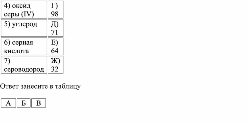 4. Некоторый элемент образует простое вещество А желтого цвета, известное человеку с глубокой древности. Кусочки этого вещества использовались для обряда изгнания злых духов. Элемент также образует соединения Б и В. Соединение Б – опасный газ, в изобилии образующийся на дне Черного моря, а соединение В – опасная жидкость, известная под псевдонимом «купоросное масло». Определите вещества А, Б, В и соотнесите названия со значениями их молярных масс.