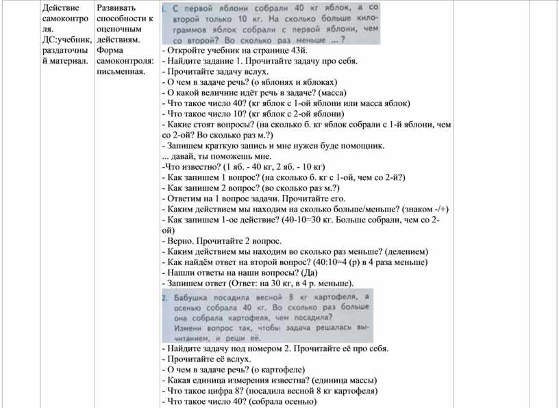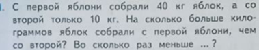 - Откройте учебник на странице 43й. - Найдите задание 1. Прочитайте задачу про себя. - Прочитайте задачу вслух. - О чем в задаче речь? (о яблонях и яблоках) - О какой величине идёт речь в задаче? (масса) - Что такое число 40? (кг яблок с 1-ой яблони или масса яблок) - Что такое число 10? (кг яблок с 2-ой яблони) - Какие стоят вопросы? (на сколько б. кг яблок собрали с 1-й яблони, чем со 2-ой? Во сколько раз м.?) - Запишем краткую запись и мне нужен буде помощник. ... давай, ты поможешь мне. -Что известно? (1 яб. - 40 кг, 2 яб. - 10 кг) - Как запишем 1 вопрос? (на сколько б. кг с 1-ой, чем со 2-й?) - Как запишем 2 вопрос? (во сколько раз м.?) - Ответим на 1 вопрос задачи. Прочитайте его. - Каким действием мы находим на сколько больше/меньше? (знаком -/+) - Как запишем 1-ое действие? (40-10=30 кг. Больше собрали, чем со 2-ой) - Верно. Прочитайте 2 вопрос. - Каким действием мы находим во сколько раз меньше? (делением) - Как найдём ответ на второй вопрос? (40:10=4 (р) в 4 раза меньше) - Нашли ответы на наши вопросы? (Да) - Запишем ответ (Ответ: на 30 кг, в 4 р. меньше).