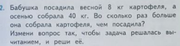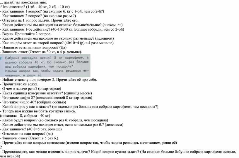 - Найдите задачу под номером 2. Прочитайте её про себя. - Прочитайте её вслух. - О чем в задаче речь? (о картофеле) - Какая единица измерения известна? (единица массы) - Что такое цифра 8? (посадила весной 8 кг картофеля) - Что такое число 40? (собрала осенью) - Какой вопрос у нас в задаче? (во сколько раз больше она собрала картофеля, чем посадила?) - Теперь вам нужно выбрать краткую запись. (посадила - 8, собрала - 40 кг) - Какой будет вопрос? (во сколько раз б. собрала, чем посадила) - Каким действием мы находим ответ, если во сколько раз б.? (делением) - Как запишем? (40:8=5 раз. больше) - Ответили на наш вопрос? (да) - Запишем ответ (Ответ: в 5 раз б.) - Прочитайте ниже вопроса пояснение (измени вопрос так, чтобы задача решалась вычитанием, реши её) 2 - Предположите, как можно изменить вопрос задачи? Какой вопрос нужно задать? (На сколько больше бабушка собрала картофеля осенью, чем весной) - Запишем краткую запись (записывают) - Как запишем решение? (40 - 8 = 32 кг. Больше собрала) - Ответили на вопрос задачи? (да) - Запишем ответ. (Ответ: на 32 кг б.)