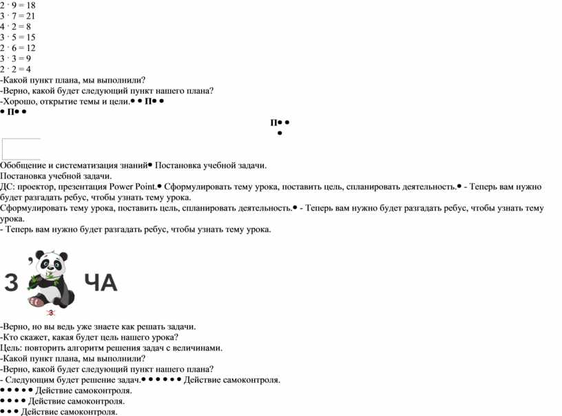 -Скажите, какой будет первый план урока? -Верно повторение. На доске 2 колонки с карточками 1 колонка выражения (примеры) 2 колонка ответы. Ваша задача решить 2 ˑ 9 = 18 3 ˑ 7 = 21 4 ˑ 2 = 8 3 ˑ 5 = 15 2 ˑ 6 = 12 3 ˑ 3 = 9 2 ˑ 2 = 4 -Какой пункт плана, мы выполнили? -Верно, какой будет следующий пункт нашего плана? -Хорошо, открытие темы и цели. |