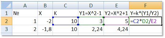 Столбец заполнится значениями X от -2 до 2 с шагом 0,2.