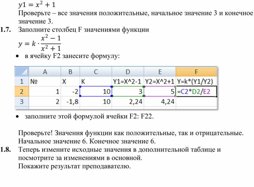 1.6. Аналогичным образом заполните столбец E значениями функции: