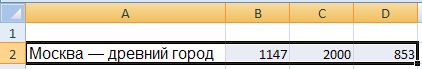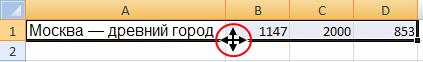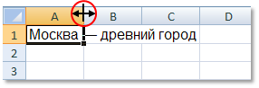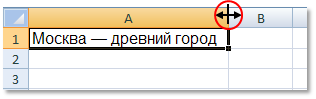 1.3. В ячейку А1 (см. рис. 1) занесите текст «Москва — древний город» и сделайте размер столбца по ширине текста (рис. 2). Для ввода данных необходимо сделать активной нужную ячейку и набрать данные (до 240 символов), а затем нажать Enter или клавишу перемещения курсора.