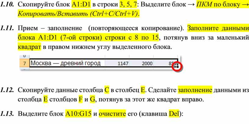 копирование). Заполните данными блока А1:D1 (7-ой строки)