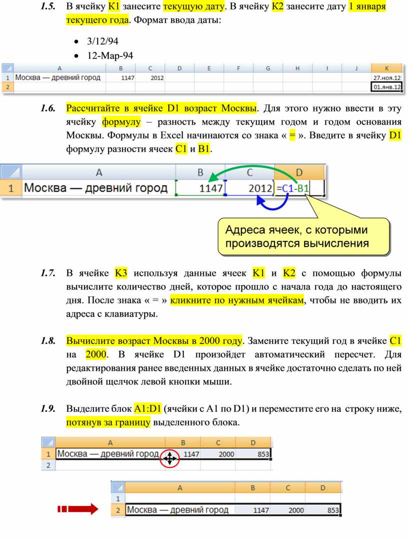 ячейке D1 возраст Москвы. Для этого нужно ввести в эту ячейку формулу – разность между текущим годом и годом основания Москвы.