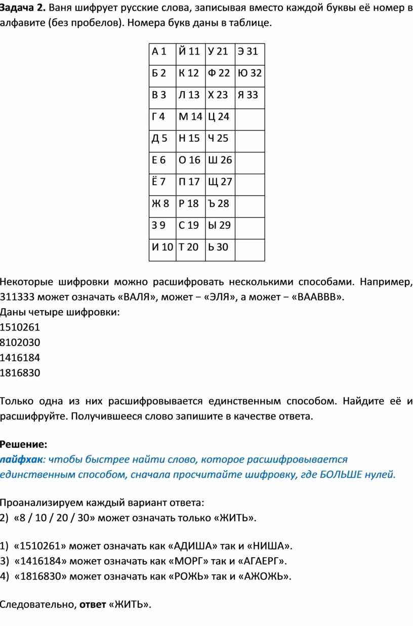 Задача 2. Ваня шифрует русские слова, записывая вместо каждой буквы её номер в алфавите (без пробелов). Номера букв даны в таблице.
