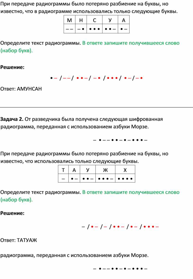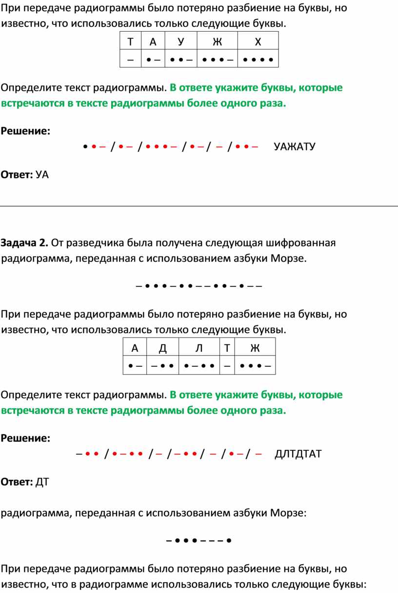 Задача 2. От разведчика была получена следующая шифрованная радиограмма, переданная с использованием азбуки Морзе.