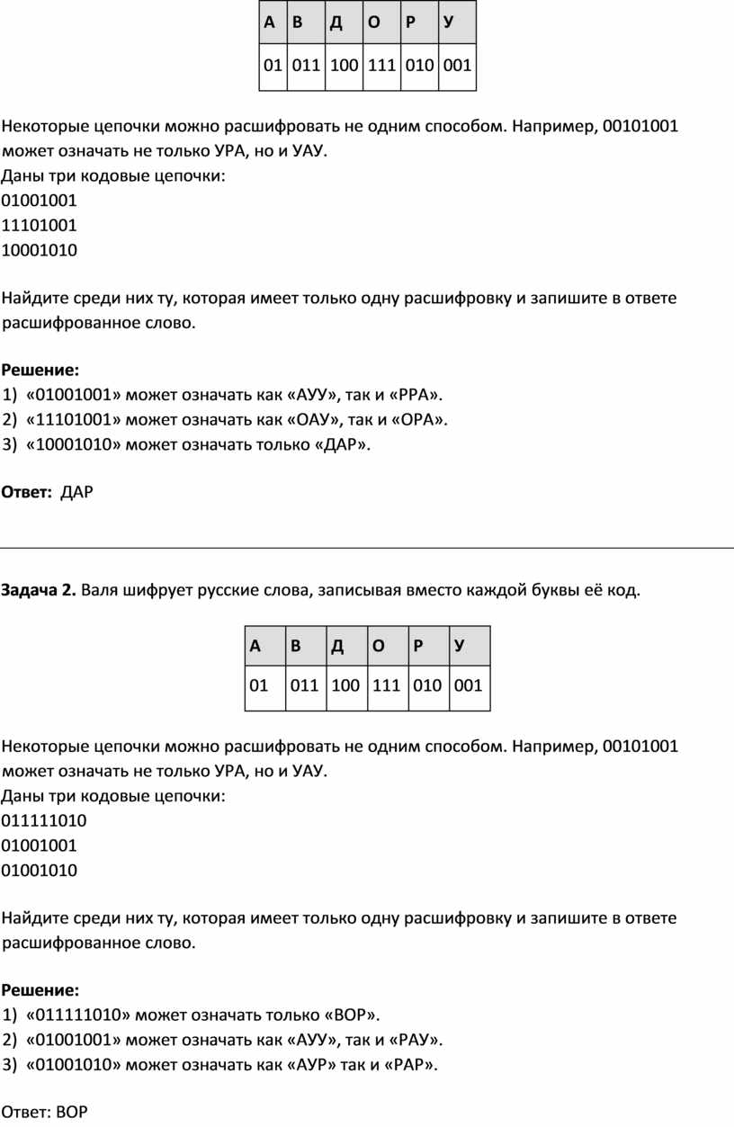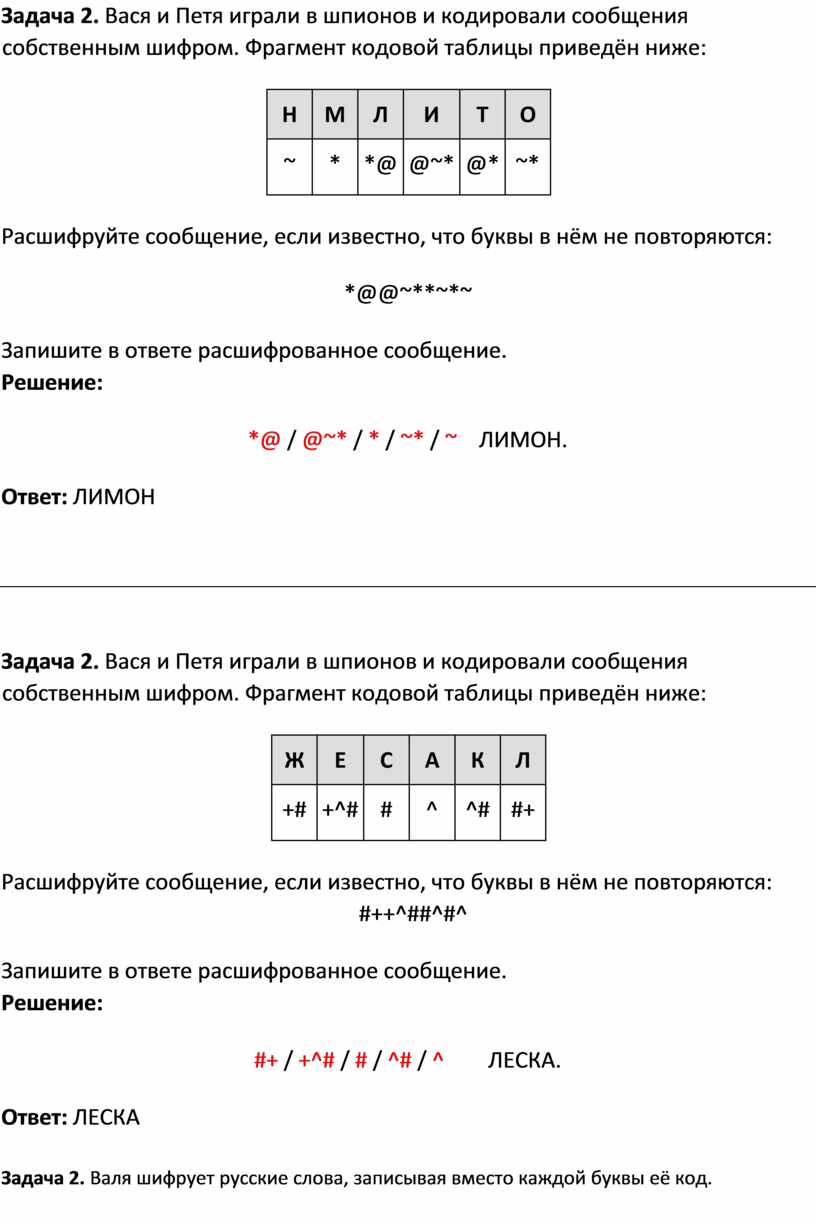Задача 2. Вася и Петя играли в шпионов и кодировали сообщения собственным шифром. Фрагмент кодовой таблицы приведён ниже: