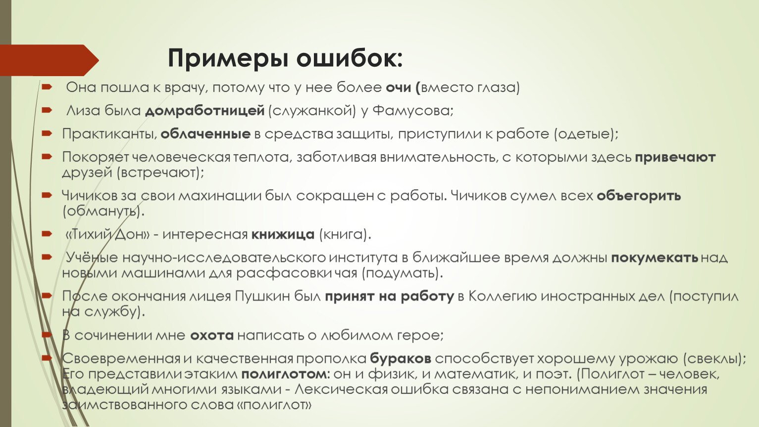 Своевременная и качественная прополка бураков способствует хорошему урожаю (свеклы); Его представили этаким полиглотом: он и физик, и математик, и поэт. (Полиглот – человек, владеющий многими языками - Лексическая ошибка связана с непониманием значения заимствованного слова «полиглот»