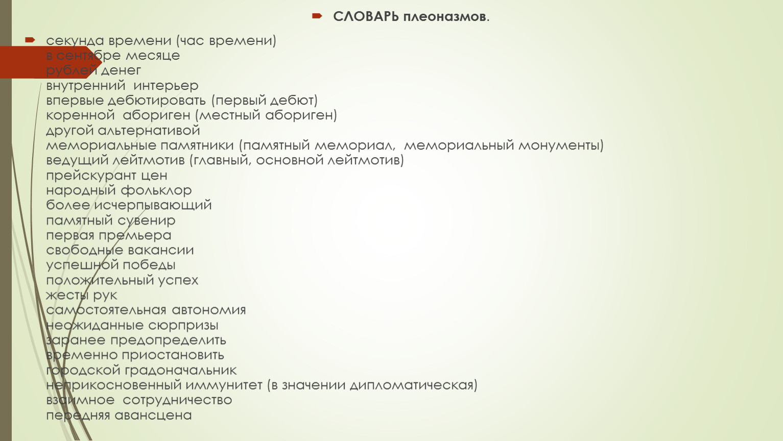 секунда времени (час времени)в сентябре месяцерублей денегвнутренний интерьервпервые дебютировать (первый дебют)коренной абориген (местный абориген)другой альтернативоймемориальные памятники (памятный мемориал, мемориальный монументы)ведущий лейтмотив (главный, основной лейтмотив)прейскурант ценнародный фольклорболее исчерпывающийпамятный сувенирпервая премьерасвободные вакансииуспешной победыположительный успехжесты руксамостоятельная автономиянеожиданные сюрпризызаранее предопределитьвременно приостановитьгородской градоначальникнеприкосновенный иммунитет (в значении дипломатическая)взаимное сотрудничествопередняя авансцена