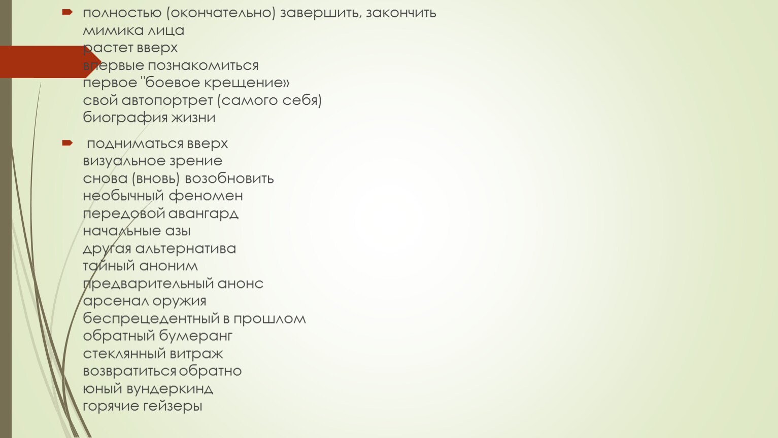 полностью (окончательно) завершить, закончитьмимика лицарастет вверхвпервые познакомитьсяпервое "боевое крещение»свой автопортрет (самого себя)биография жизни