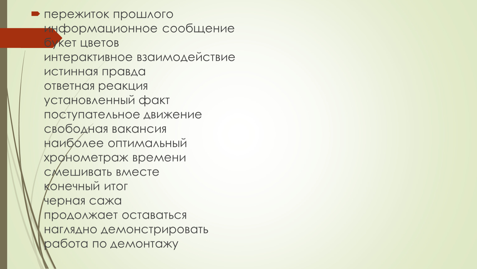 пережиток прошлогоинформационное сообщениебукет цветовинтерактивное взаимодействиеистинная правдаответная реакцияустановленный фактпоступательное движениесвободная вакансиянаиболее оптимальныйхронометраж временисмешивать вместеконечный итогчерная сажапродолжает оставатьсянаглядно демонстрироватьработа по демонтажу